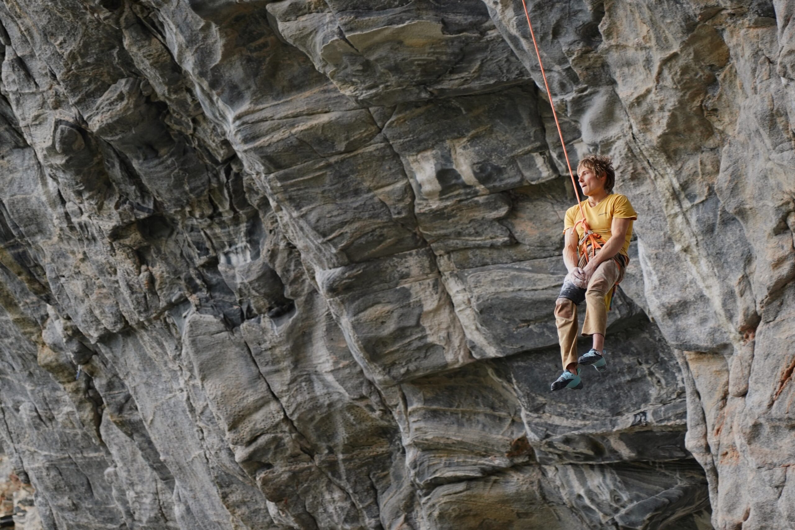 “It took me two weeks to learn how to put on the kneepads correctly,” he said of keeping the pads from sliding as he climbed. He learned the nuances of kneebarring, how to take the weight off his arms as he climbed, and how to trust the knees more. “I have a lot to learn,” Alex said of his kneebarring.