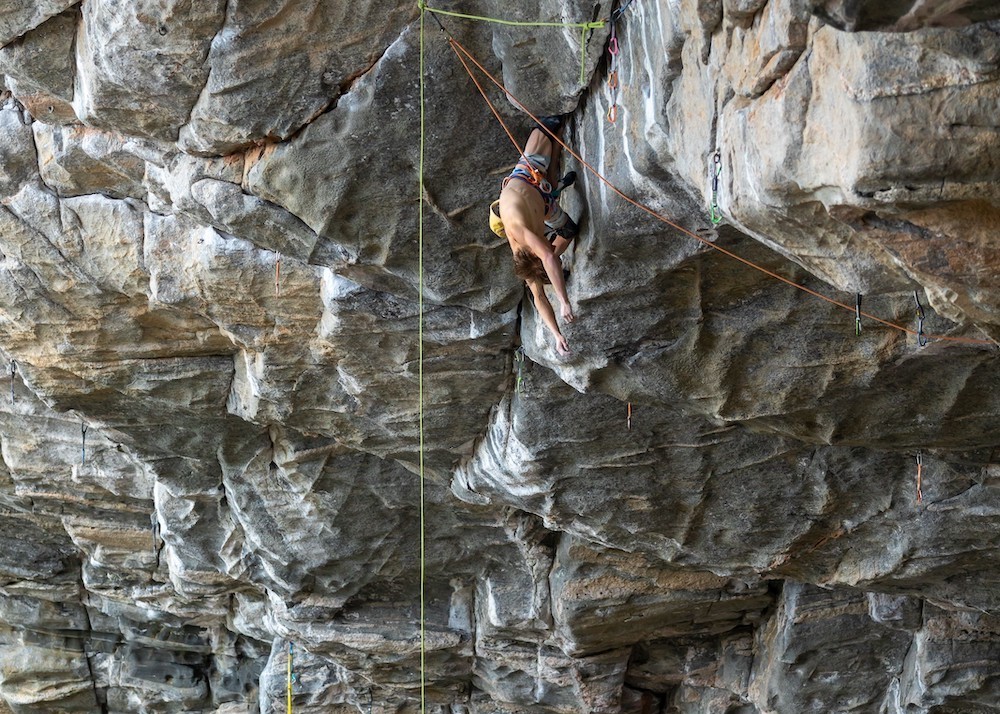In 2015, only one or two ropes hung from the cave but in the past few years, climbers added more. The hanging ropes allow climbers to jumar up and access different parts of the wall. Alex ascended up to the last four bolts of Move and worked the difficult last moves. This allowed him to gain confidence so that he was able to climb to the ending well and then execute. When he finally stuck the end sequence, he was able to ride the momentum and send The Illusionist (9a) as well.